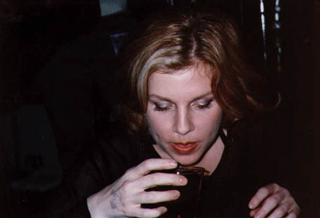 Tanya takes a sip of Southern Comfort between songs to help soothe her throat.